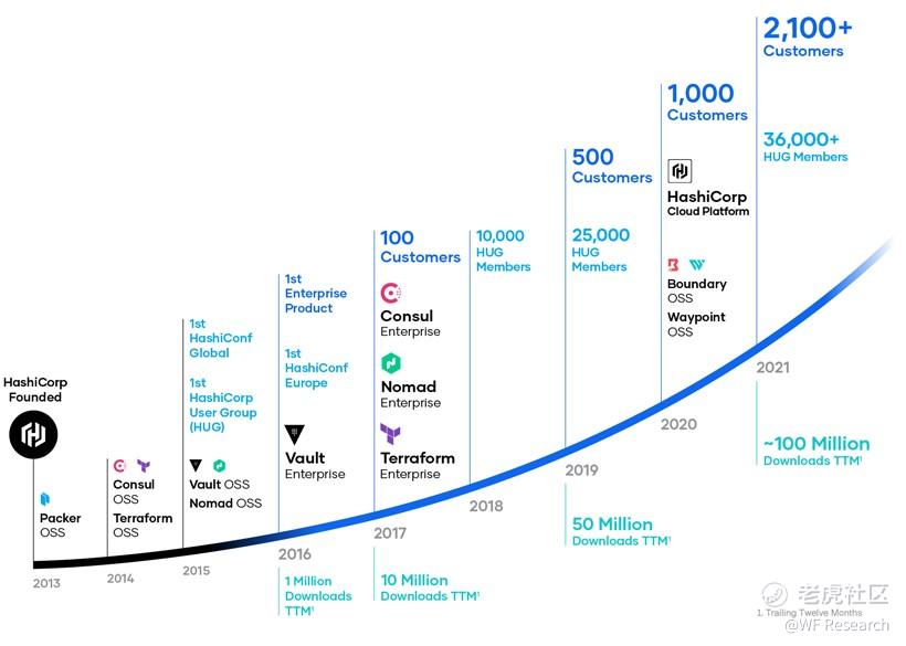 HashiCorp 的开源产品在 2021 财年共被下载 1 亿多次,这是一个令人印象深刻的数字。此外,该公司还在其开源产品的基础上销售专有的商业软件,这类软件主要面向大型企业客户(更多信息可详见 GTM 一节),公司的这一策略也在发挥着积极的作用。虽然 HashiCorp 没有披露 ARR(年度经常性收入),但截至上一季度,该公司的隐含 ARR 为 2.949 亿美元(季度订阅收入 * 4),同比增长 50%;在上个报告期内,第四季度平均收入留存率达 124%。截至最近一个季度,HashiCorp 共有 2101 名客户,其中 ARR 大于 10 万美元的客户数达 558 名,ARR 大于 100 万美元的客户数达 58 名。HashiCorp 成立于 2013 年,于 2016 年正式将其软件商业化。根据 Pitchbook 的数据显示,HashiCorp 迄今已在种子轮至 E 轮的股权融资中筹得 3.495 亿美元。该公司优先推崇远程办公,在全球拥有 1400 名全职员工。以下是 HashiCorp 的时间轴。