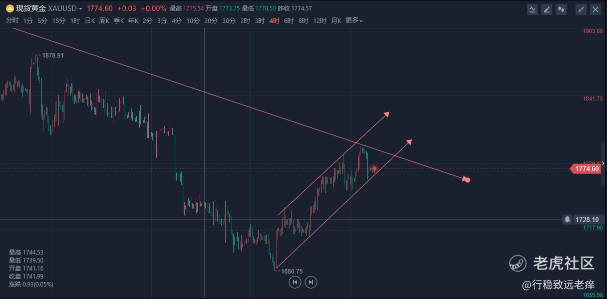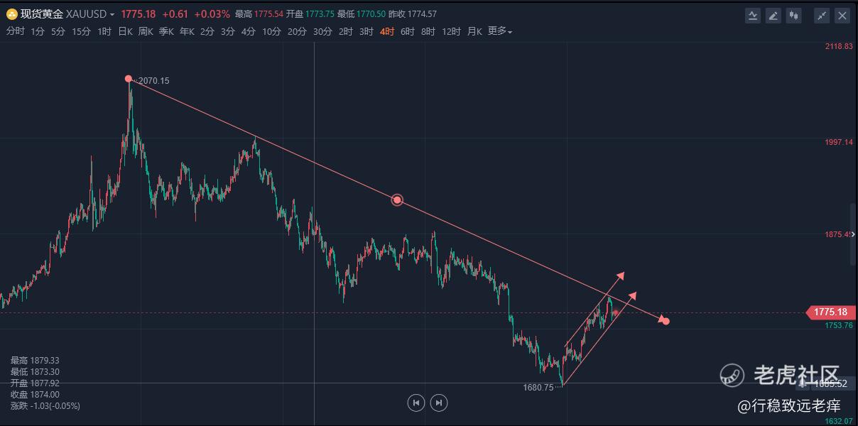 图示非常清晰了,这波反弹的黄金整体的上升通道,马上要和这波大周期的下降趋势的上升压力线形成交叉之势了,空间和时间范围都很小了。