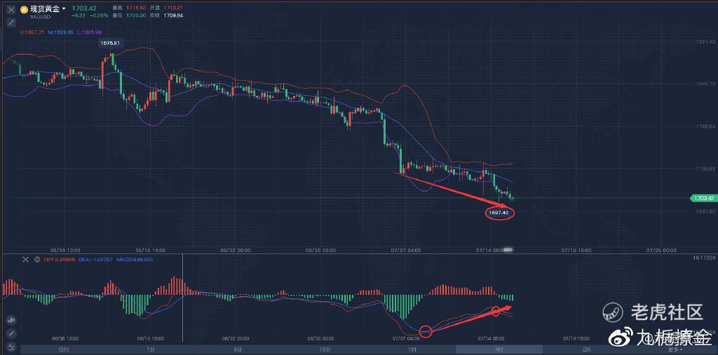 首先,看4小时周期变化,4小时线已经出现底背离的信号了,上周五中午快慢线在零轴底部出现金叉开始向上走,这一周是没有机会回到零轴上了,所以期待下周的行情会怎么走吧,快慢线在昨天中午12点又出现死叉开始向下走,并且出现绿色的动能柱,现在开始向下走的趋势,再看上边K线部分,布林带现在是开口的状态,上周是梯形下跌,这周是从周一震荡下跌,直到周三晚上CPI数据的公布行情才发生大的变化,实体是在周四零点到现在只有凌晨4点出现了一根阳线,现是连着而出现阴线。