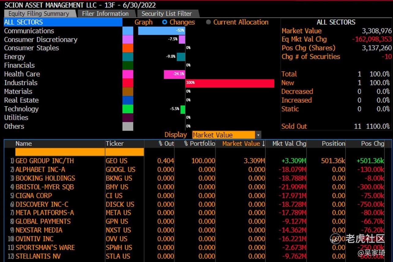 电影《大空头》主角的原型Michael Burry,清算了整个投资组合,在Q2期末只持有私人监狱运营商GEO集团。Michael Burry在Q2抛售了11只股票的多头头寸,包括$谷歌C(GOOG)$ 、$Meta Platforms(META)$ 、Bristol-Meyers Squibb和Nexstar。