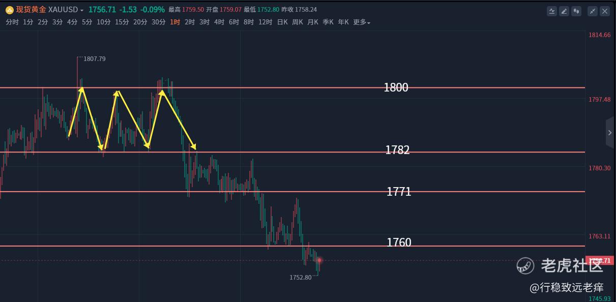 先是在1800-1782这个平台做震荡,随后随着美元反弹跌破了该区间。