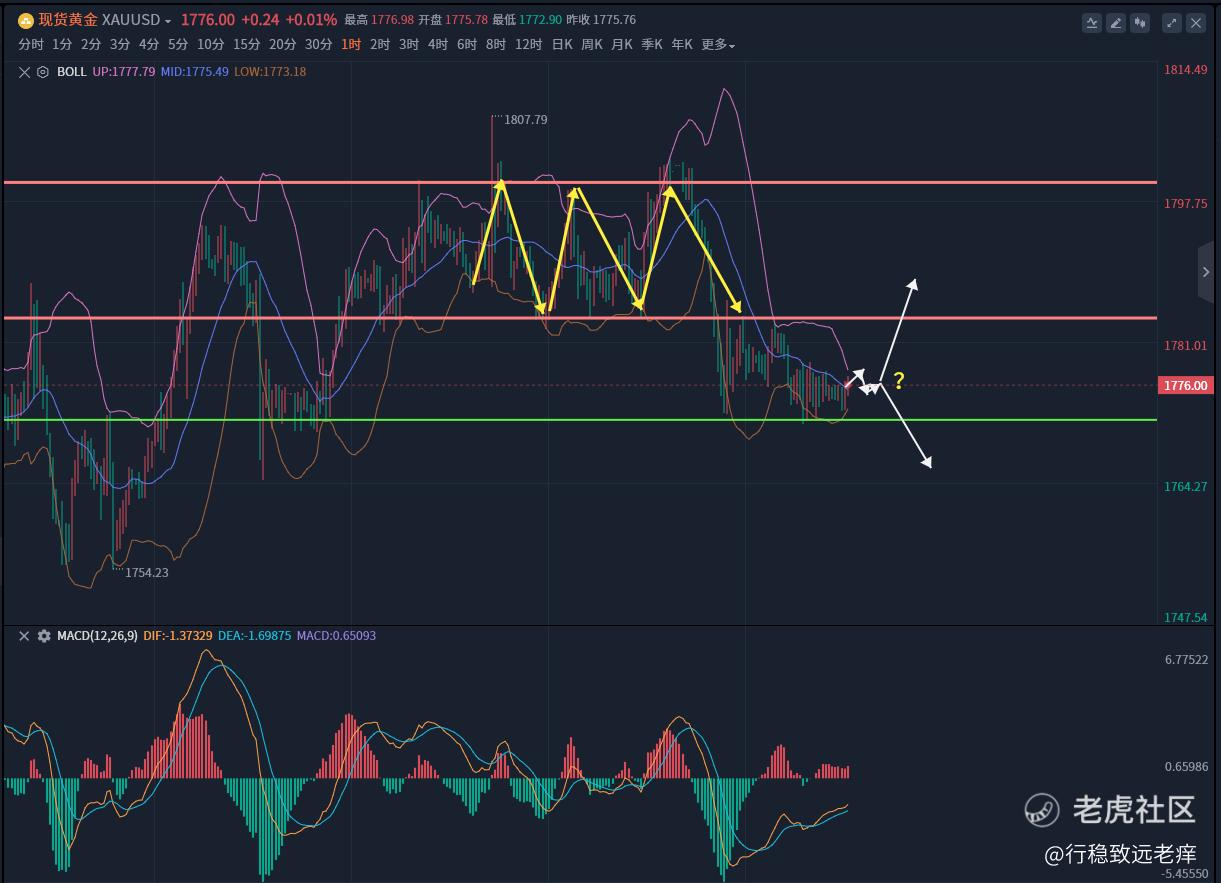 昨晚在亚盘反弹无力,黄金整体反弹趋势要结束时,美盘的开盘也让黄金进行了短时间的下挫,但是空头并没有发力,在1771的这波下跌的底部支撑位置再次撑住了,随即在75附近展开了震荡。
