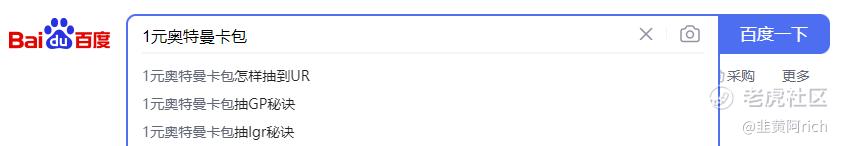 在百度搜索输入“1元奥特曼卡包”,智能搜索链接到的第一条就是“1元奥特曼卡包抽卡技巧”。