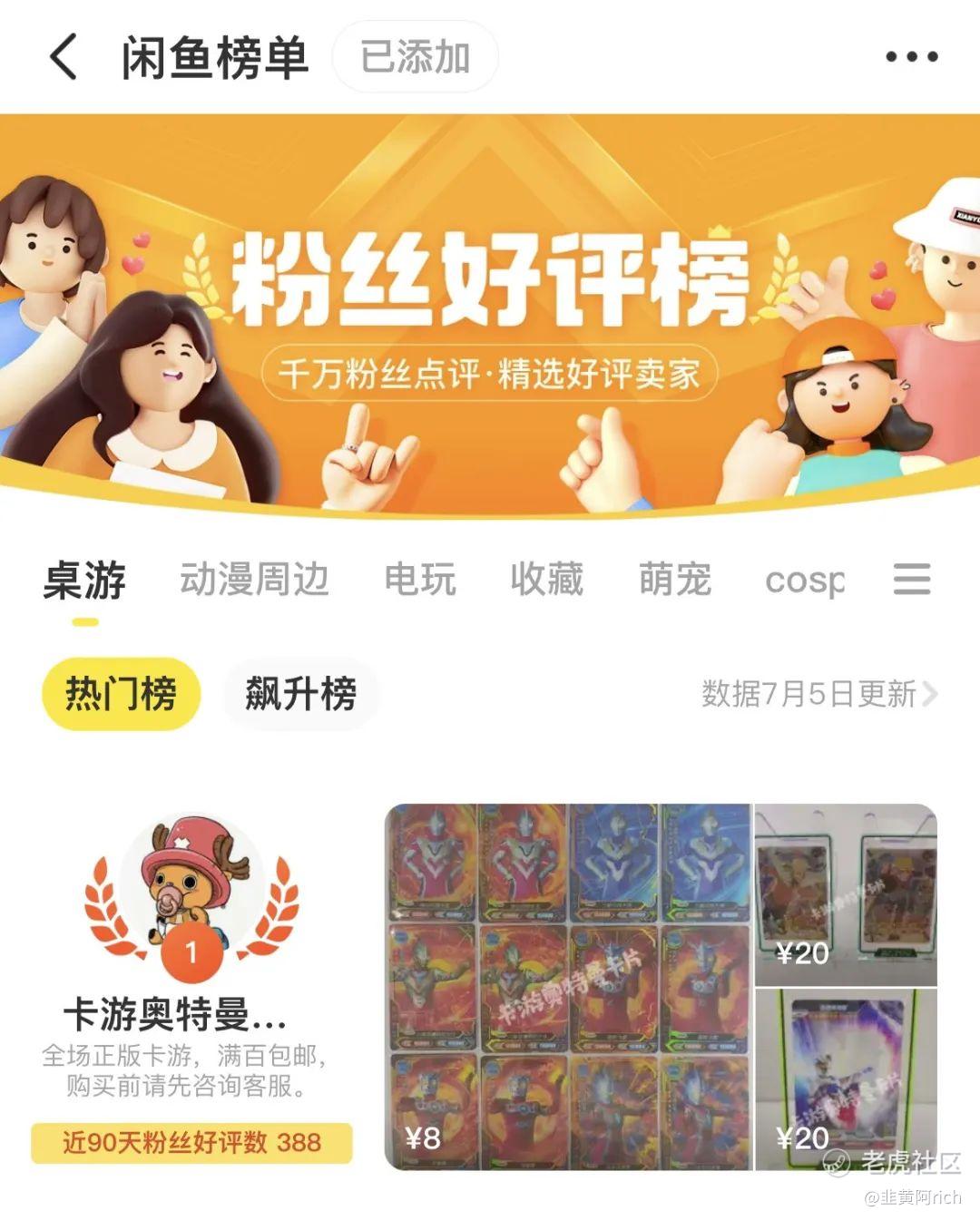用户“卡游奥特曼卡片”跻身闲鱼“桌游粉丝好评榜”热门榜类目Top1