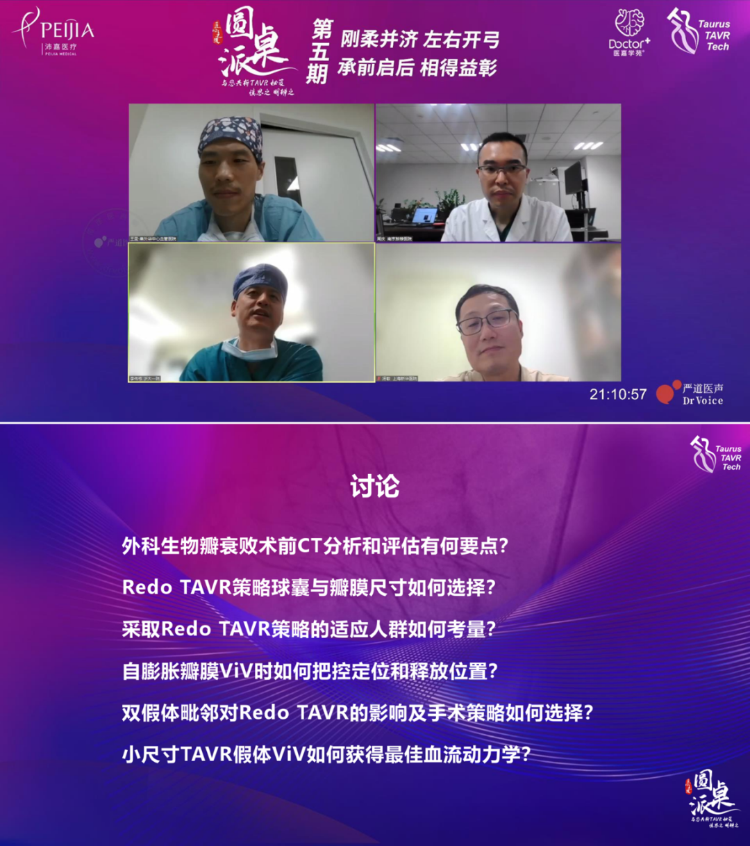2022年6月28日 (周二) 晚19:30-21:00,由沛嘉医疗主办的匠心之道·圆桌派第五期生物瓣衰败Redo TAVR专题线上研讨会顺利举办!结构性心脏病是近年来心血管介入领域发展最快速的方向之一,尤其是中国经导管瓣膜病介入治疗器械的研究和国产器械创新发展近几年突飞猛进。围绕临床中TAVR技术的重点和难点,病例剖析的疑点和挑战,匠心之道·圆桌派旨在搭建一个平台可以把各个心脏中心的手术实操经验进行分享,助力我国TAVR技术的快速发展和进一步普及。