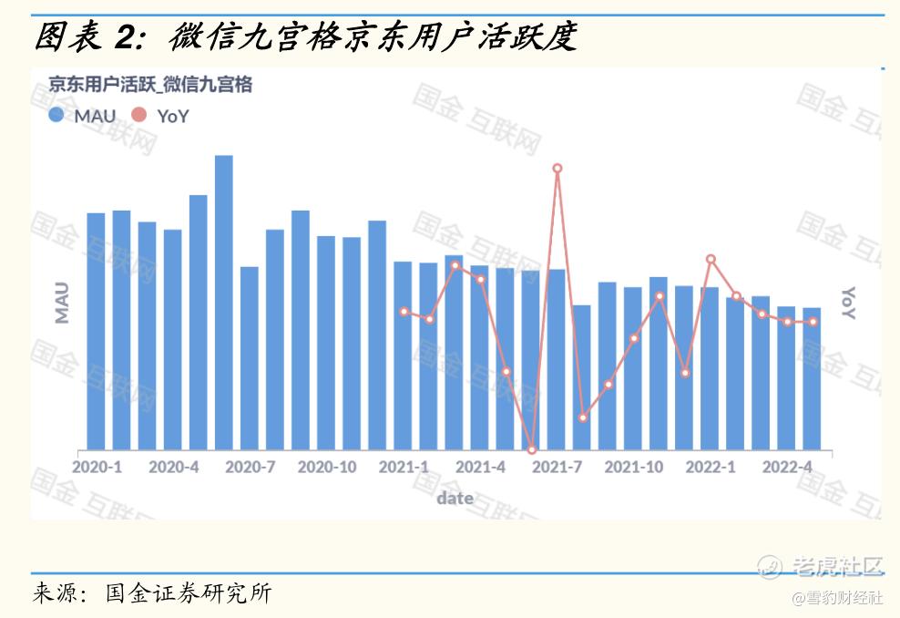 一方面,经过长达8年的合作,京东从微信拉新的边际效应呈递减趋势。国金证券研报显示,微信九宫格京东用户活跃度正波动下降,与两年前相比差距明显。