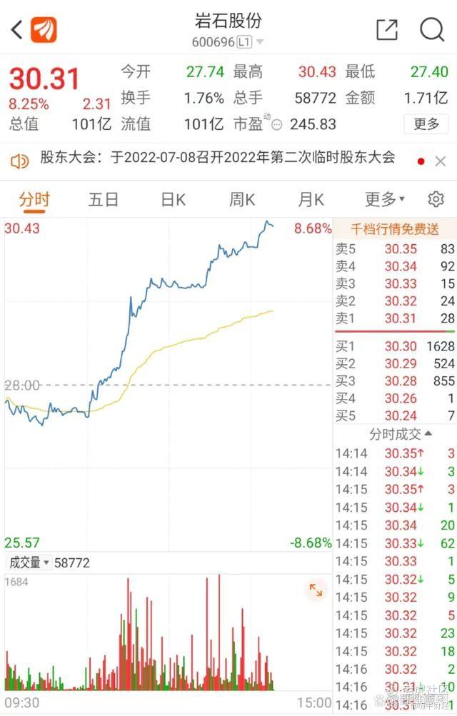 上海贵酒股份有限公司(简称:上海贵酒,股票名:岩石股份:证券代码:600696)继以3.63%的上涨于7月6日成为白酒概念板块43只股票涨幅之首,7月7日又以最高8.68%的涨幅再次冲击市值新顶峰,两天涨幅最高时合计超过11%。
