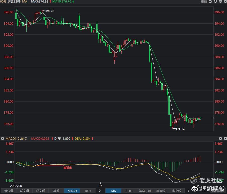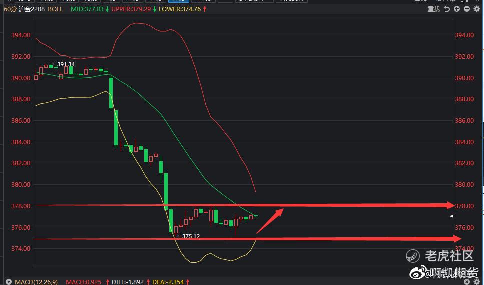 沪金主力合约今日开盘价376.6,收盘价77.0,日内跌幅0.31%,蜡烛选取一根实体阳柱,金价日内走势跟前面文章分析的一样,在375.0-378.0区间内震荡。