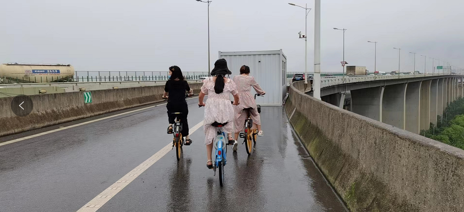 就这样,一行人淋着雨,在雨中骑行上大桥,并在天兴州大桥上骑行。