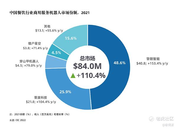 IDC在6月份最新发布的《中国餐饮行业商用服务机器人市场份额报告》显示,2021年中国商用服务机器人市场规模达到0.84亿美元(约合5.4亿元人民币),同比增速达110.4%,呈现爆发态势。