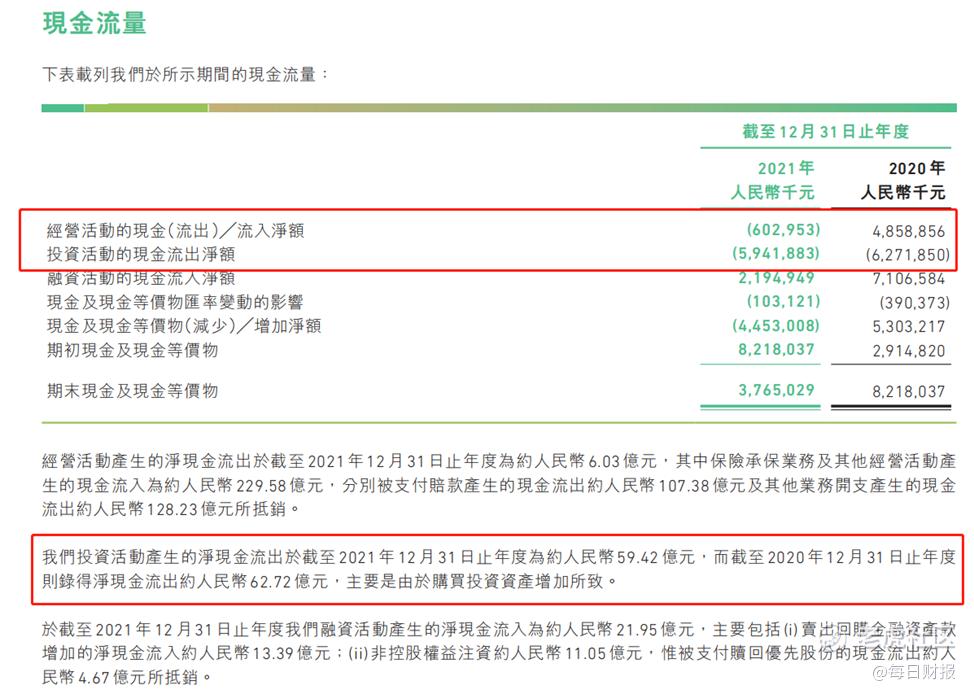 值得注意的是,2021年众安在线现金流表现不佳。经营活动现金流量净额为-6.03亿元,而这一数据在2020年为48.59亿元。投资活动现金流量净额为-59.42亿元,主要是购买资产所致,但是具体购买了什么资产财报中并无披露。