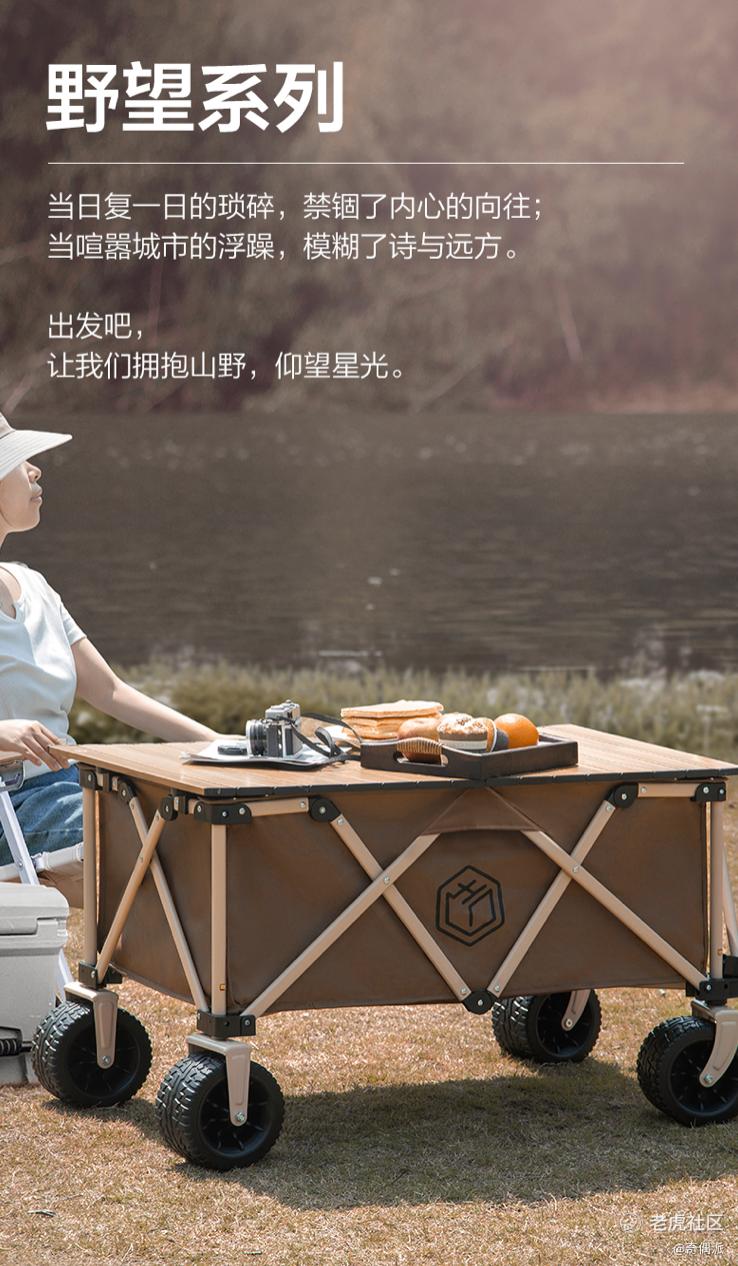 不管自驾还是打车,从下车到营地哪怕只有一百米的距离,搬着帐篷、椅子、桌子等等走这最后一百米也是费力的事。京东京造以汽车后备箱到帐篷之间这段距离作为突破点,打造了一款承重120KG,可折叠的露营车产品,来解决“露营最后一公里”的难题。