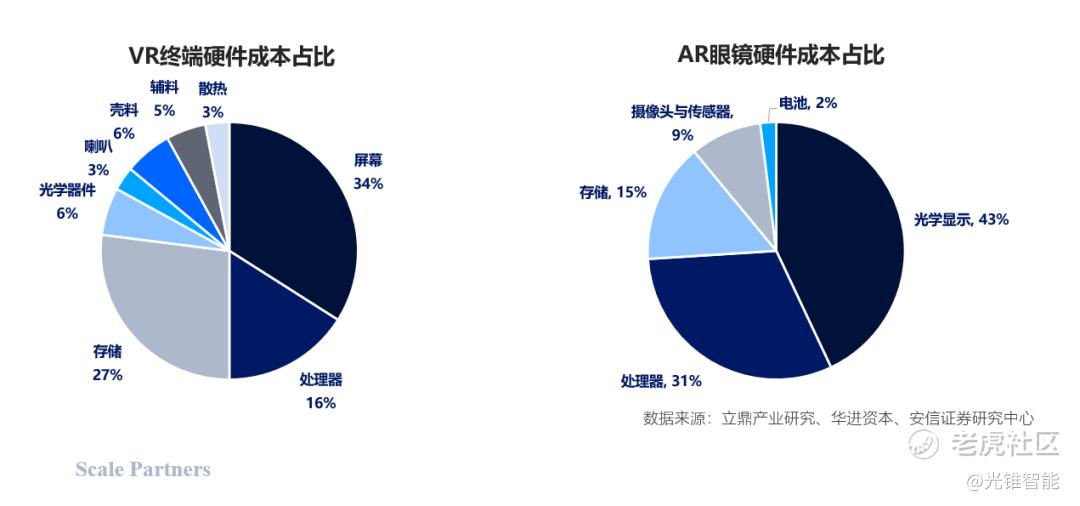 VR硬件最为关键的零部件是主芯片、光学模组和显示器。以Oculus Quest 2的零部件成本为例,主芯片、光学模组和显示器在总成本中的占比分别是20%、15%和25%;AR硬件方面,光学显示是核心部分,其余零部件的供应链与智能手机的供应链重合度较高,量产及普及的壁垒较低。