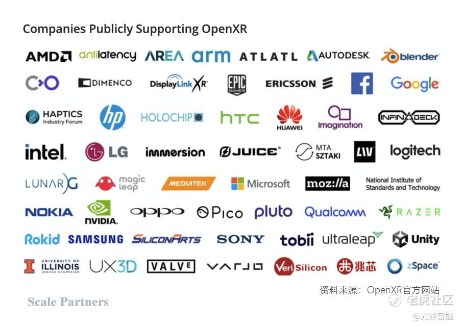 为打造具备互通性的开放生态,Khronos组织发起了开放式、无版权费用的XR行业标准规范:OpenXR。按照OpenXR标准开发的游戏等内容可以通过API接口在不同品牌的VR/AR中运行,极大地丰富了VR/AR设备的内容生态。微软、Unity、Epic、Oculus等公司或平台已经加入OpenXR,我国的华为、兆芯、Pico等也加入OpenXR联盟参与标准的讨论与制定工作。