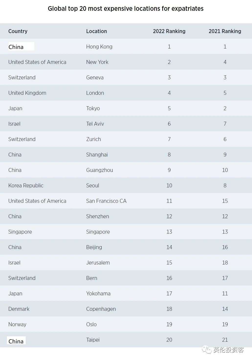 此外,中国上海、广州、深圳、北京和台北等多个城市均跻身全球最贵城市前20名。