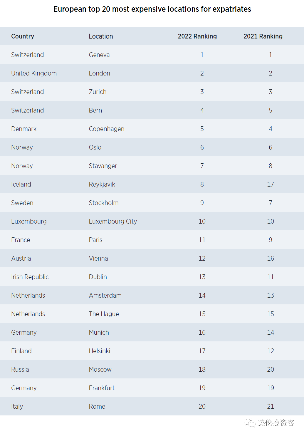 从欧洲范围来看,伦敦排名第二,瑞士的日内瓦和苏黎世分列第一、三位。此外,冰岛的首都雷克雅未克的生活成本上升了9个名次,进入排名欧洲第8位。