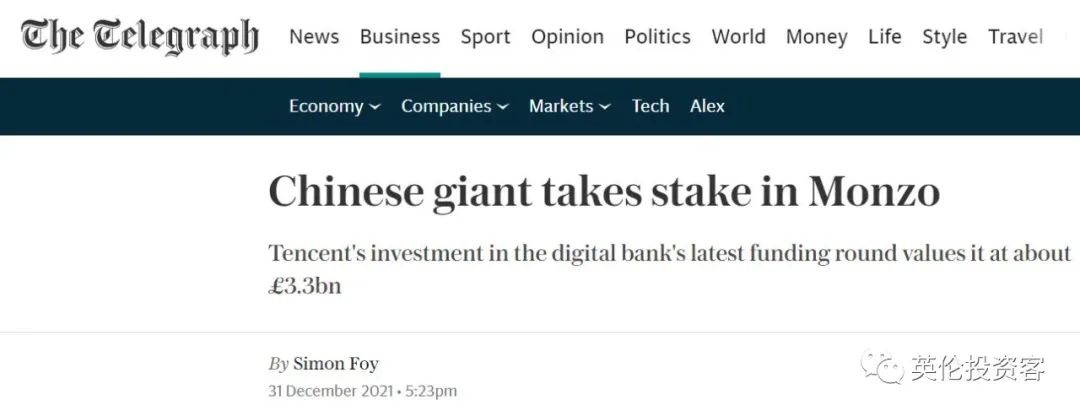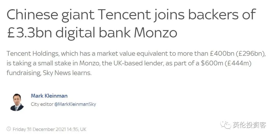 英伦投资客刚刚(2022年1月1日)获悉,中国科技巨头——腾讯控股(Tencent Holdings)已经买下了英国明星数字银行Monzo的部分股权,该银行最新市值为33亿英镑(约280亿人民币)。