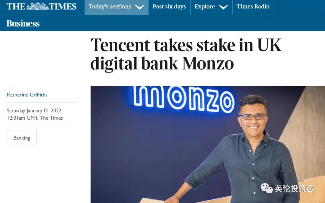 《泰晤士报》:腾讯入股英国数字银行Monzo