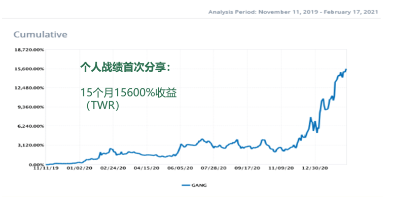 麦刚在现场首次公开分享了他个人的股票投资战绩,自2019年11月起的15个月间,收获了156倍的惊人收益。对于取得如此高收益的投资成绩,麦刚说道,“好的投资成绩来自于长时间的历练、亏损的折磨以及对交易市场深刻的理解和敬畏,并非一蹴而就之事。”