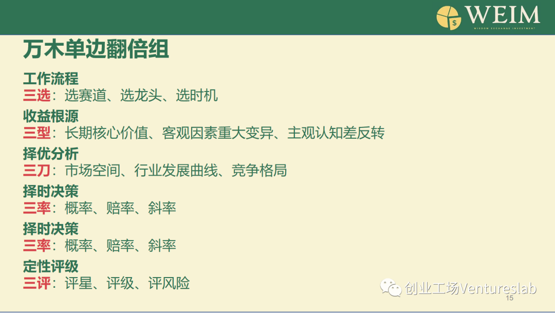 麦刚先生在会上十分热情的分享了万木“单边翻倍群组”的投资理念,投资框架同样遵循Rule of 3原则,总结为“五个三”:三选,三型,三刀,三率,三评。