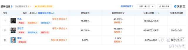 据天眼查的资料显示,这家公司的大股东是林晶和王屹芝,分别持股约46.6%,李斌持股6.67%。林晶是资深媒体人、制片人,曾任劳雷影业副总经理,此前还参与过电影《百鸟朝凤》的宣发。