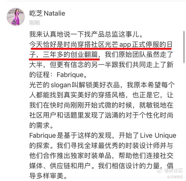 “今天恰好是时尚穿搭社区光芒app正式停服的日子,三年多的创业翻篇,我们原始团队虽然走了大半,但更有信念的另一半跟我们共同走上了新的征程:Fabrique。”