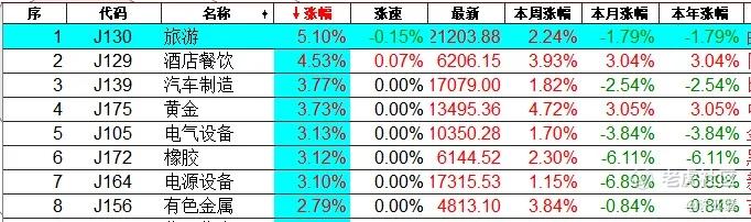 旅游和酒店餐饮涨幅居前,不过如果从年内的涨幅来看,汽车制造和旅游哪怕是经历了今天的大涨,整体还是收跌的,甚至后面的电气设备,橡胶,电源设备,有色金属也一样,后面这几个板块实际上就是与新能车和光伏相关。