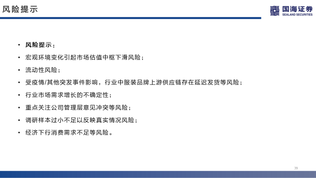 风险提示:宏观环境变化引起市场估值中枢下滑风险;流动性风险;受疫情/其他突发事件影响,行业中服装品牌上游供应链存在延迟发货等风险;行业市场需求增长的不确定性;重点关注公司管理层意见冲突等风险;调研样本过小不足以反映真实情况风险;经济下行消费需求不足等风险。