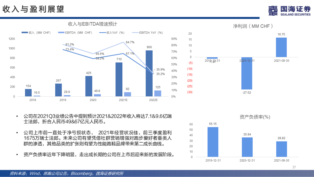 2021年为昂跑扭亏为盈关键年份,未来仍将保持高增长:通过对比,昂跑在运动品牌中体现出高毛利特点,但期间费用高企影响盈利;预计2021/2022年收入将达7.1亿和9.6亿瑞士法郎,折合人民币49亿和67亿元人民币,同比增67%和35%。昂跑上市前一直处于净亏损状态,2021年经营状况佳,前三季度盈利1675万瑞士法郎。未来昂跑有望凭借社群营销增强对跑步爱好者垂类人群的渗透,而品类的扩张有望为性能跑鞋品牌带来第二成长曲线。