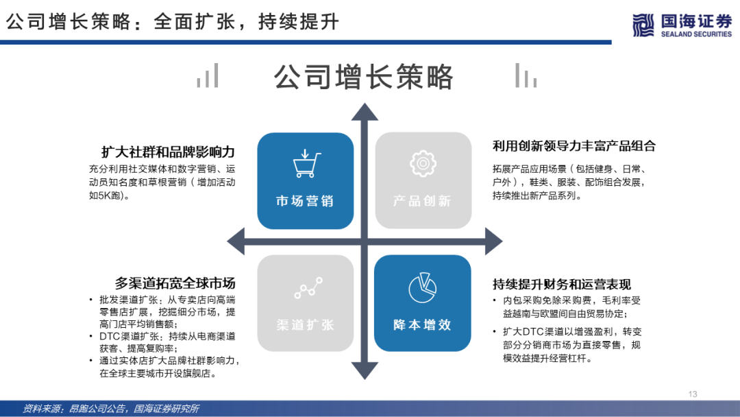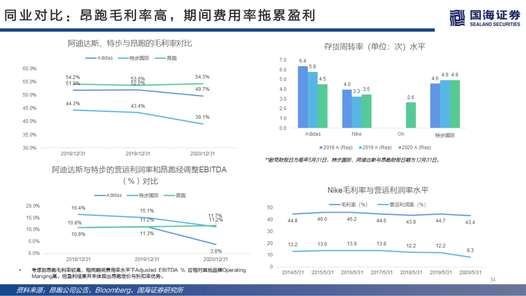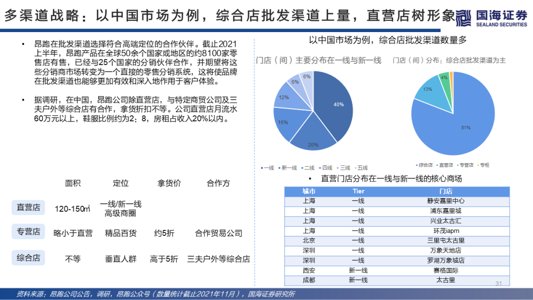 昂跑专业创新与精神内核兼备,多渠道和DTC发力赋能具有领导力的品牌:作为新一代跑鞋,昂跑所具备专业、创新、环保的特质吸引了其信众加入“部落”,其七大科技提供“轻盈触地,强力回弹的”运动体验。品牌又因其多元化的产品组合与精细化服务方式,以及组织丰富、高频的社群活动加深“部落”联系,增加用户粘性,本质上体现了品牌的领导力与号召力。多渠道战略下昂跑品牌终端零售业态分为直营、专营与综合店,计划持续发力DTC以维持高毛利水平,产品极少打折,起到保护品牌形象与维持品牌调性的作用。