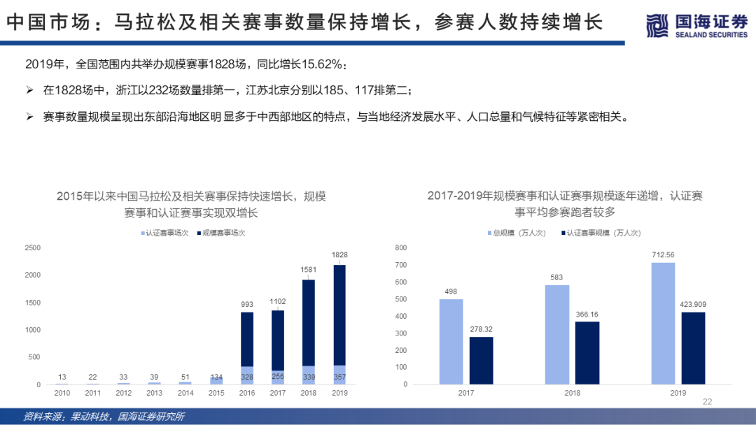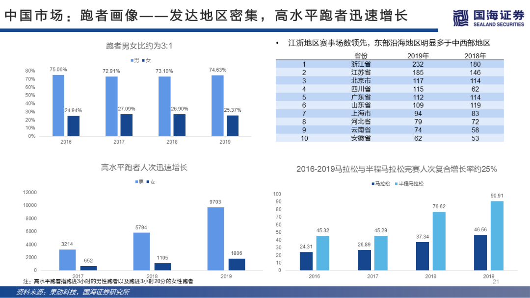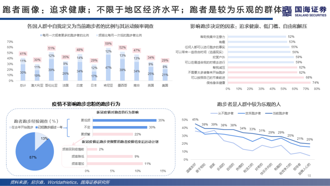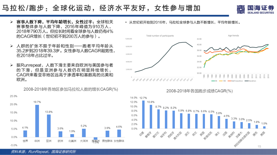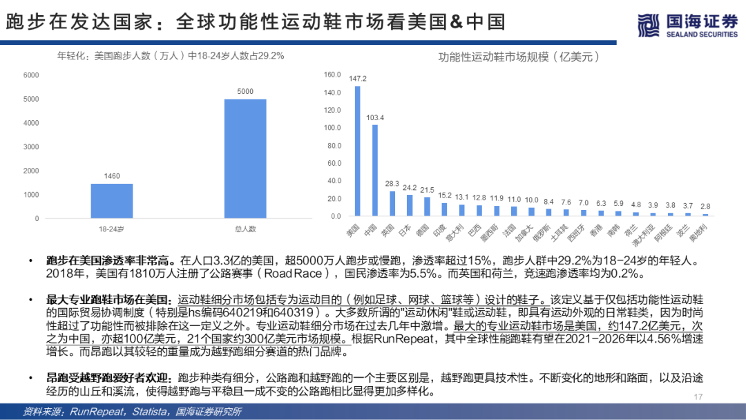 跑者众而无国界,性能跑鞋行业4.56%CAGR稳步增长:跑步运动因不受装备限制而被多群体选择,历史复盘可见跑鞋迭代高度融入科技与创新。全球马拉松赛事在新世纪整体参与人数增长快,历史峰值为910万人,也在近年来呈现出全人群的扩张。根据RunRepeat,赛事参与者平均年龄从35.2岁到2018年39.3岁。女性参与人数CAGR超男性,在2018年占比过半。日常跑步亦是人们寻求健康与减压之选,根据尼尔森的跑者画像调查,跑者众而无国界。在人口3.3亿的美国,超5000万人跑步或慢跑,渗透率超过15%。发展中国家地区仍渗透率快速提升阶段,2008年后亚非地区参与者数量与成绩CAGR均远高于发达国家/地区,近年来中国发达地区的马拉松赛事热潮及参与者的数量增长亦在一定程度上反映了经济水平与跑步渗透率的关联。根据Euromonitor,昂跑所在的大运动鞋服赛道复合增长高于其他鞋服品类。而全球性能跑鞋市场有望在2021-2026年以4.56%增速增长,昂跑以其较轻的重量成为越野跑细分赛道的热门品牌。