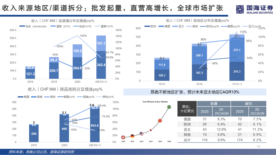 昂跑(ONON.N)是性能跑鞋行业异军突起的高成长新品牌:2010年昂跑品牌诞生,目前已在 60 多个国家/地区建立了全球客户社群,包括德国、美国、日本、中国和巴西,产品在全球约8100家零售店有售。从成立到2020年,公司的净销售额复合年增长率达85%,2020年净销售额达4.25亿瑞士法郎,预计2020-25年亚太地区营收增长亮眼,鞋服CAGR超10%。昂跑产品从瑞士研发、越南制造到全球分销的每一个环节都精益求精,为产品带来稳定品质保障。