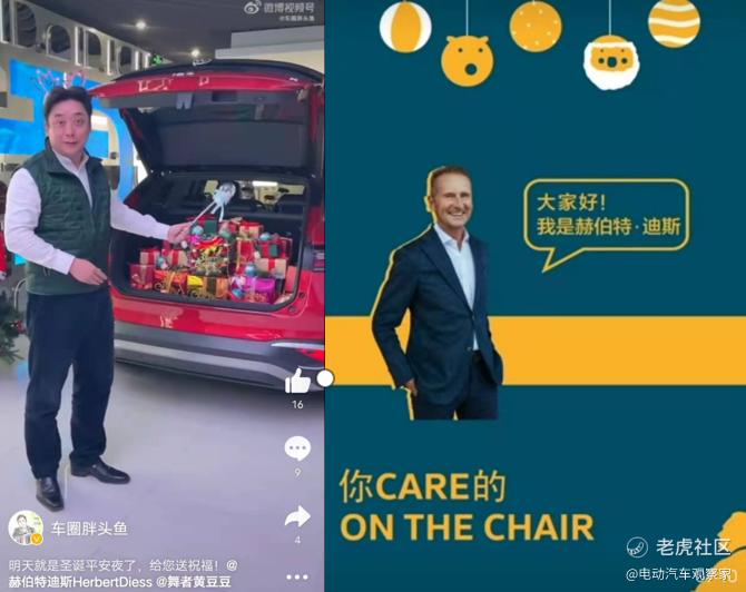 2021年圣诞节前夕,上汽大众汽车销售有限公司总经理俞经明头戴驯鹿发卡、手握仙女魔法棒,在自己的微博“车圈胖头鱼”推销ID. 4X,大众集团CEO迪斯在微博上回答网友关于大众电动化的提问,毫无传统车企高管的老姿态,满满新势力的营销感。