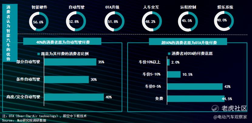 更重要的是,中国消费者为汽车智能化付费的意愿非常高。调研数据显示,40%的消费者愿意为完全自动驾驶功能买单,超半数的消费者愿意为OTA升级买单。