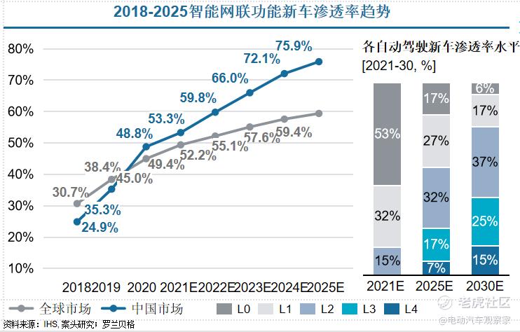 电观大会嘉宾罗兰贝格合伙人袁文博的研究数据显示,自2020年起,中国智能网联功能新车的渗透率开始超过全球市场平均水平。到2025年,中国智能网联车的渗透率预计接近76%,远高于全球近60%的水平。