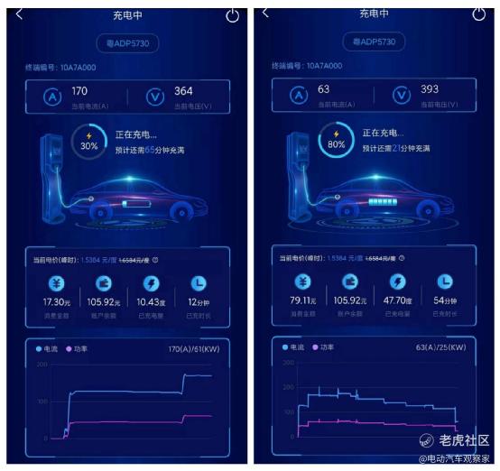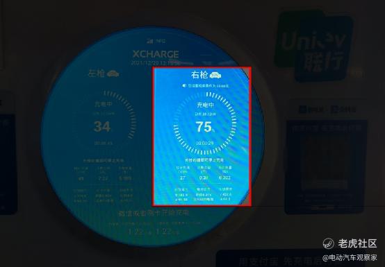 在连接充电枪后,充电桩显示测试车剩余电量75%,即行驶130公里所用电量20%。