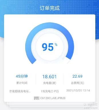 在充电至95%自动停止后,共计充入电量18.601度电。以此计算,在包含充电桩能量损耗的情况下,小鹏P7测试车的最终能耗为14.3kWh/100km。