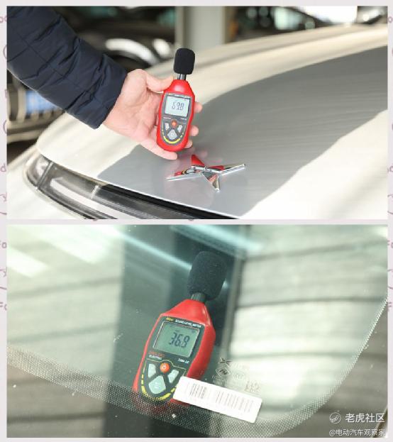分贝测试仪能对车辆静态时的车内外噪音进行很好的测试。在车外噪音69.8分贝左右时,车内噪音为36.9分贝,证明在静态停驻时,总行驶里程近17万公里的小鹏P7在NVH性能方面还能保持较高水平。