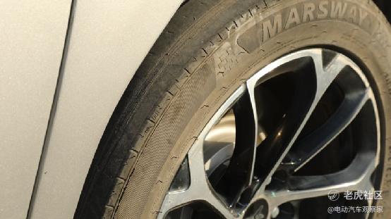 这台车在使用过程中,可能发生过交通事故,因此左后轮胎存在“吃胎”现象,加速了轮胎磨损。测试车为超长续航版车型,采用后轮驱动,外加糟糕的轮胎磨损状态,会加大电机输出能量损耗。