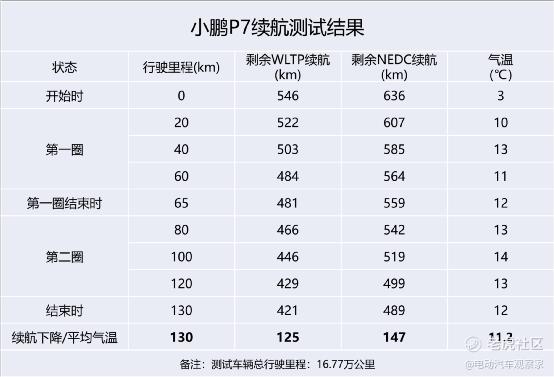 在测试开始前,小鹏P7测试车的剩余续航里程情况是:WLTP工况546公里,NEDC工况636公里。