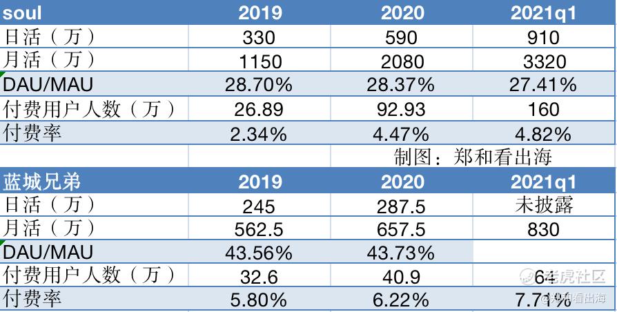 蓝城兄弟旗下产品blued的DAU/MAU在43%左右,而soul仅为28%左右;同时,soul的付费率在大幅提升后,目前也不到5%,而蓝城兄弟的付费率早已经突破7%。(注:由于soul招股书数据仅到2021Q1,为方便对比,蓝城兄弟的数据并没有放全)