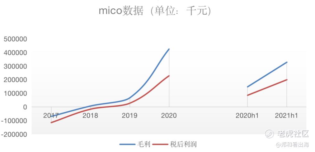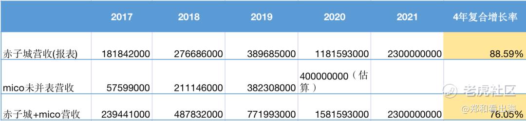 更何况,我们把米可的2017年-2020年没有并表的营收数据加上,赤子城和mico营收的整体也是实现了4年10倍的增长!
