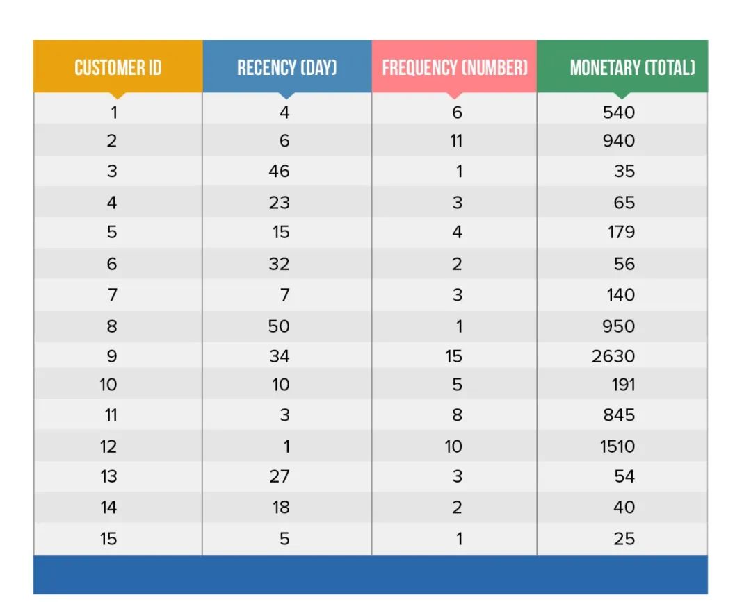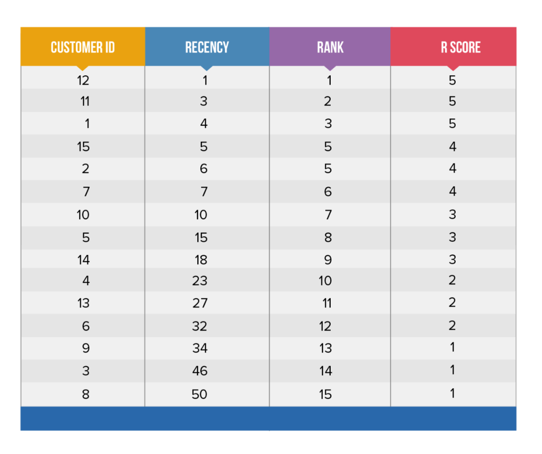 为了对此示例进行RFM分析,让我们来看看如何用RFM机制来为每一个用户打分。