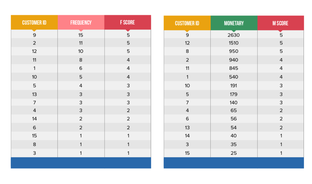 同样,我们可以按照购买频率从高到低对客户进行排序,将前20%的频率得分分配为5,依此类推。对于货币因素,前20%的客户(重度支出消费者)得分为5,最低的20%得分为1。这两组得分总结如下: