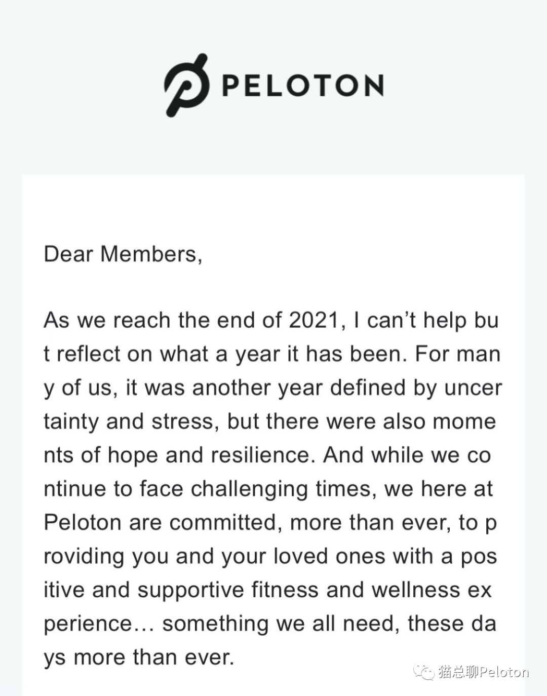 12/22,Peloton 延续每年的惯例,向会员发送了来自 CEO John Foley 的年终总结邮件,践行用户是上帝的理念,员工给老板写总结,老板给用户写😂.。