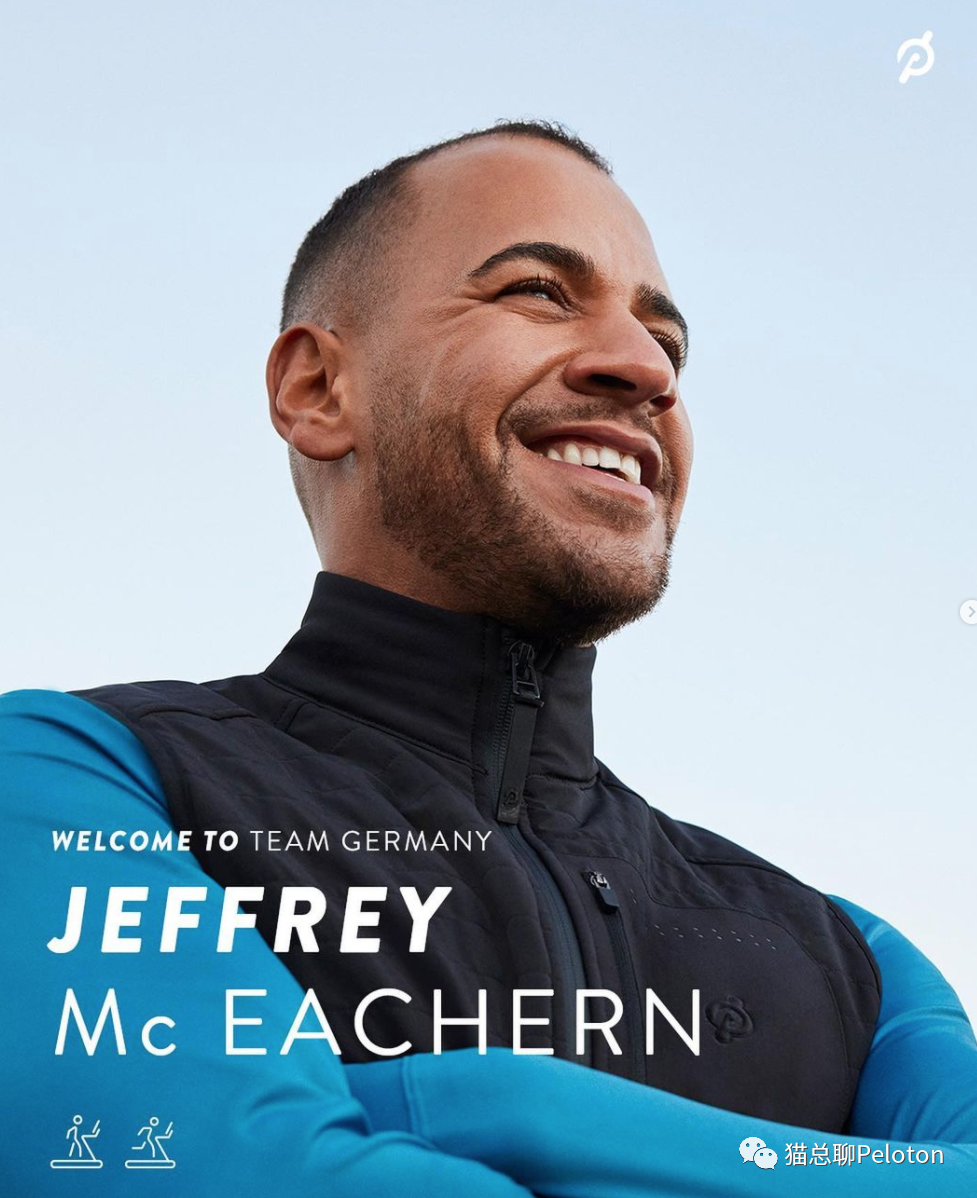 12/21,Peloton 为其德国教练团队新增了一名跑步机教练 Jeffrey Mc Eachern[4]。在加入 Peloton 之前 Jeffrey 曾担任《德国版好声音》的人才招募员,同时也是一名健身教练。他在 30 岁生日前跑完第一个半马后进行了职业转换。