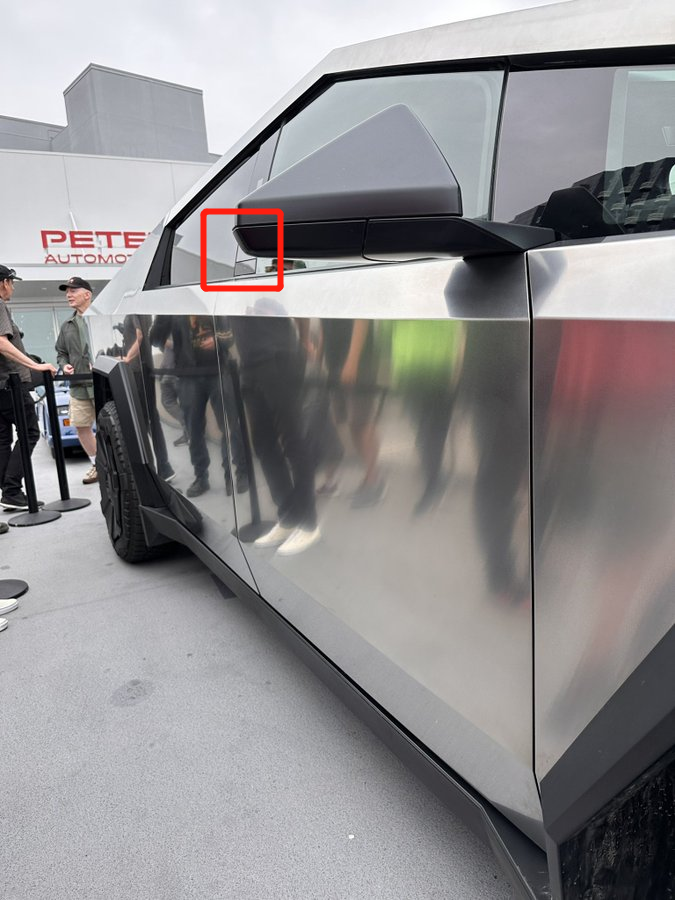 在 Cybertruck 的 B 柱和 C 柱处,都有一个物理按键,按下按键,车辆就会以温和的速度打开车门,同时,车窗也会相应降下。