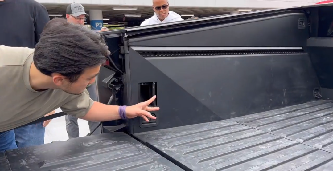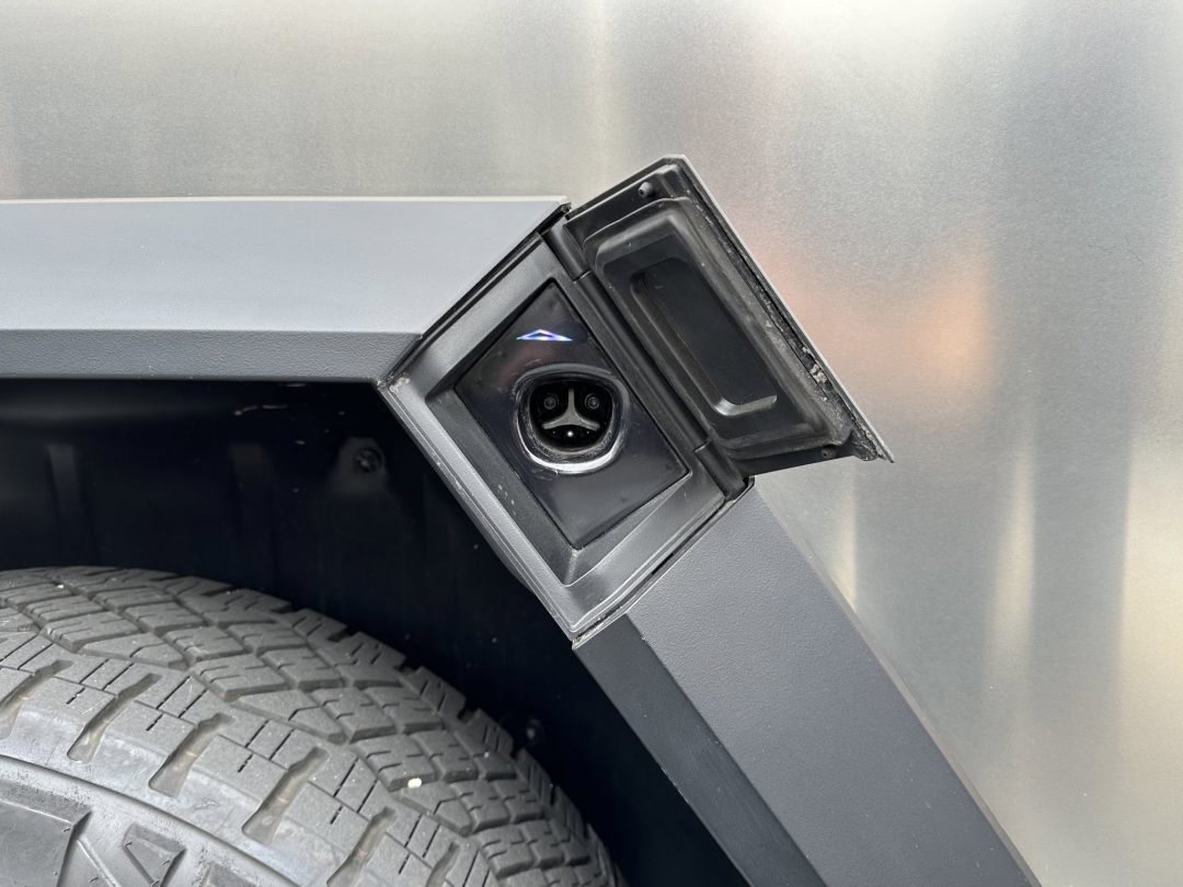 与原型车相比,最新的 Cybertruck 充电口加入了橡胶圈。在现场观众拍摄的视频中看来,只需轻轻敲击一下,舱盖便会自动打开。