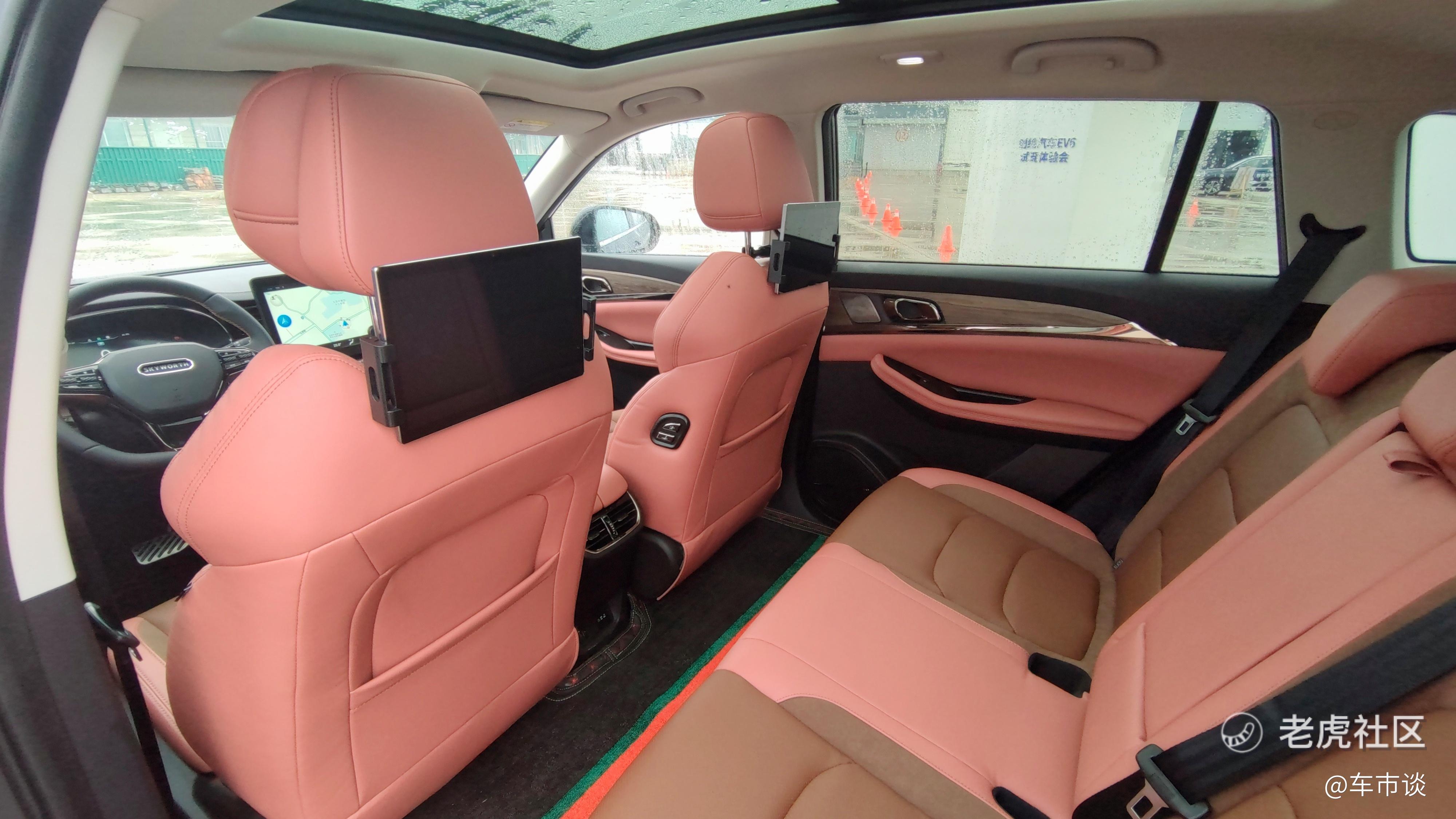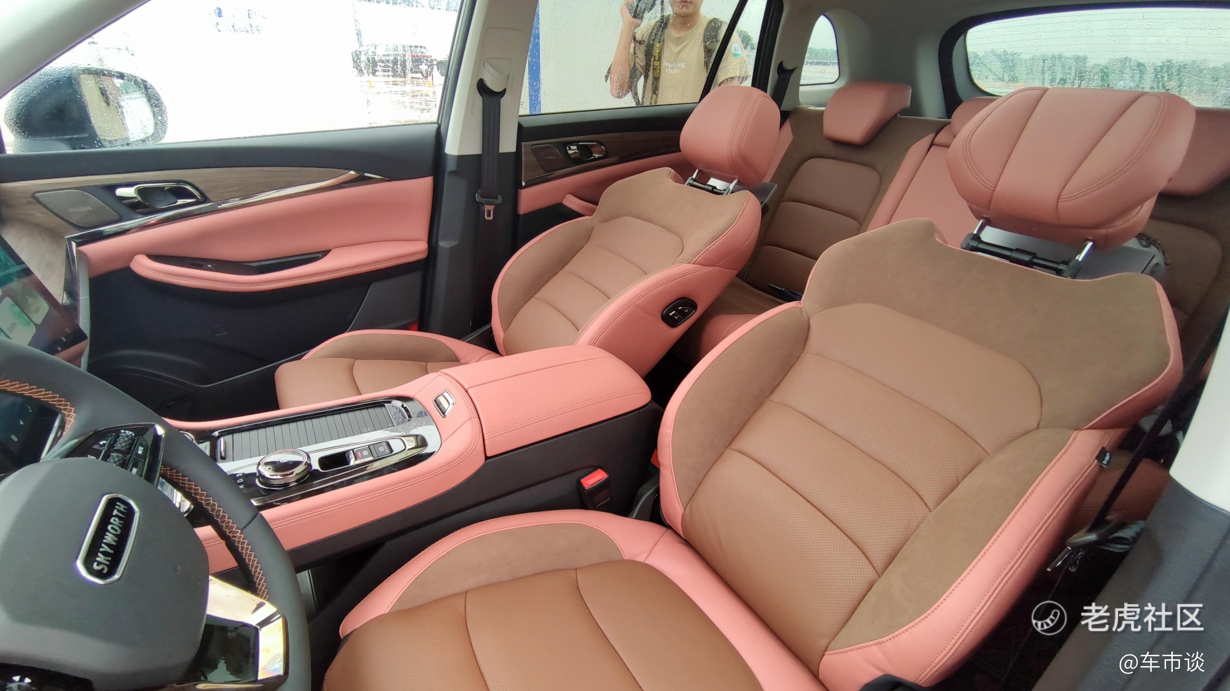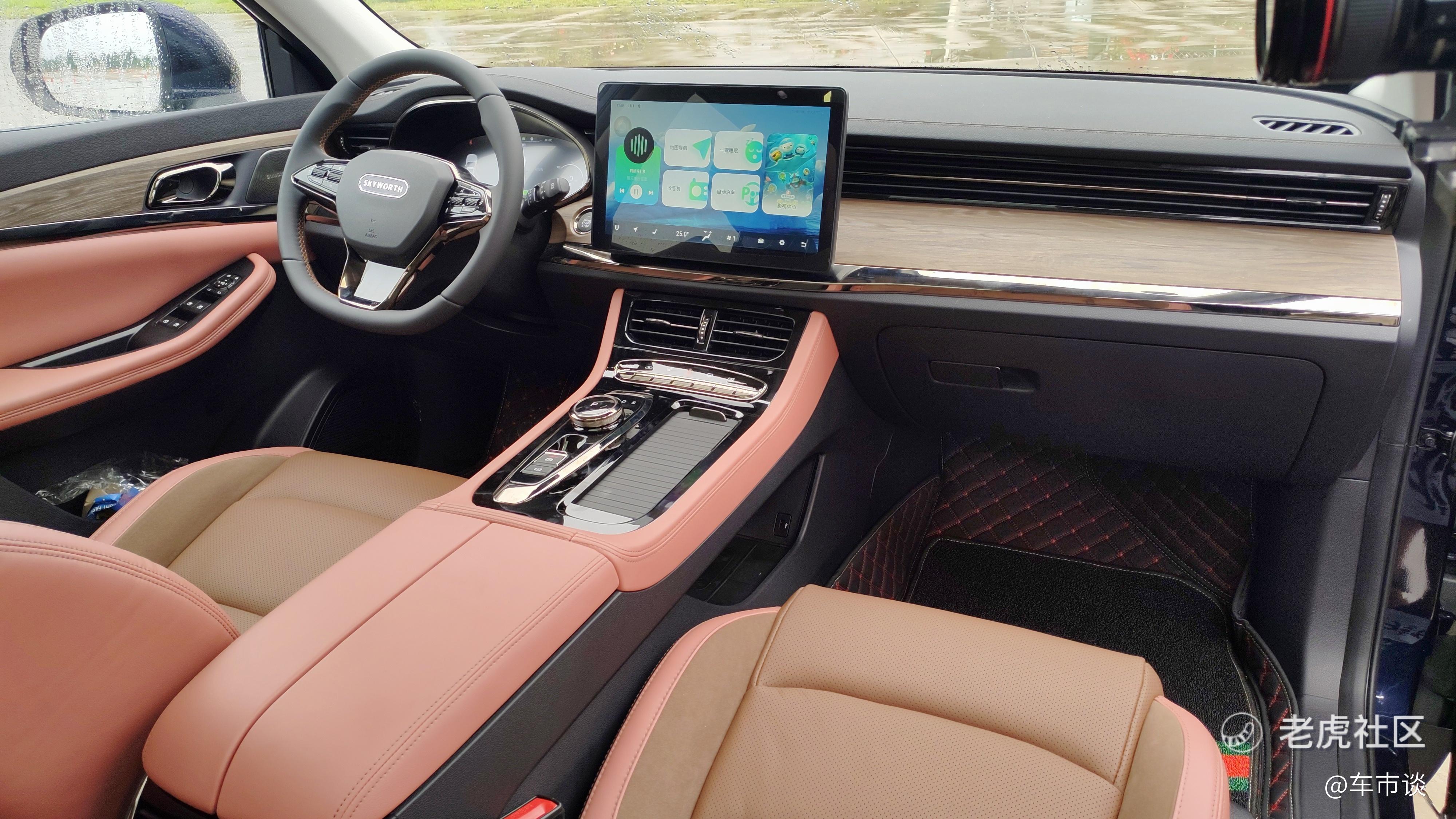 进入车内,12.3英寸全液晶仪表+中控12.8英寸多媒体显示屏的组合设计最为抢眼,创维Skylink智能网联系统也很实用,与创维、美的、京东、华为、阿里等智能家居生态实现互联互通。