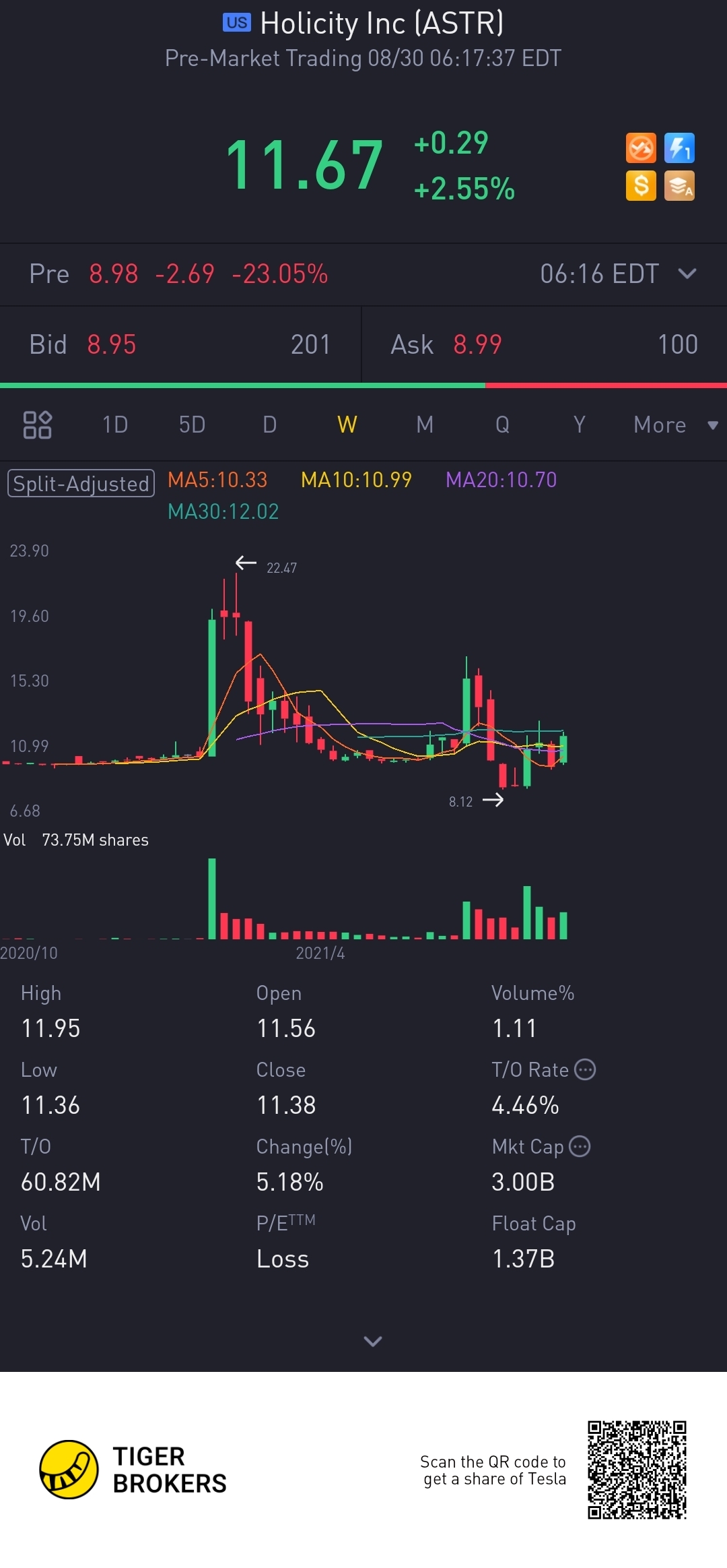 $Holicity Inc(ASTR)$-20% premarket after unsuccessful launch. Rocket took off sideways. Will Astra be given time to be successful? SpaceX had years to perfect it as they were the first. Many companies including $Rocket Lab USA, Inc.(RKLB)$have also had many successful lanuches. Race to space is intense and competitive and Astra is not yet in the game. IPO too soon before they have a successful launch is looking to be a real risk for shareholders.